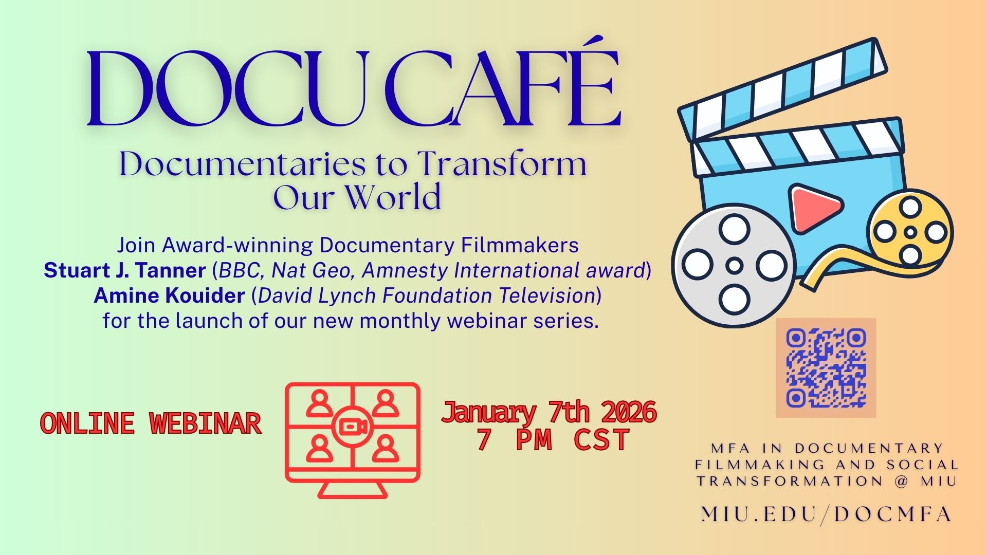 The session will be led by Stuart J. Tanner (BBC, Nat Geo, Amnesty International Award) and Amine Kouider (David Lynch Foundation, Playing for Change), program directors of MIU’s MFA in Documentary Filmmaking.