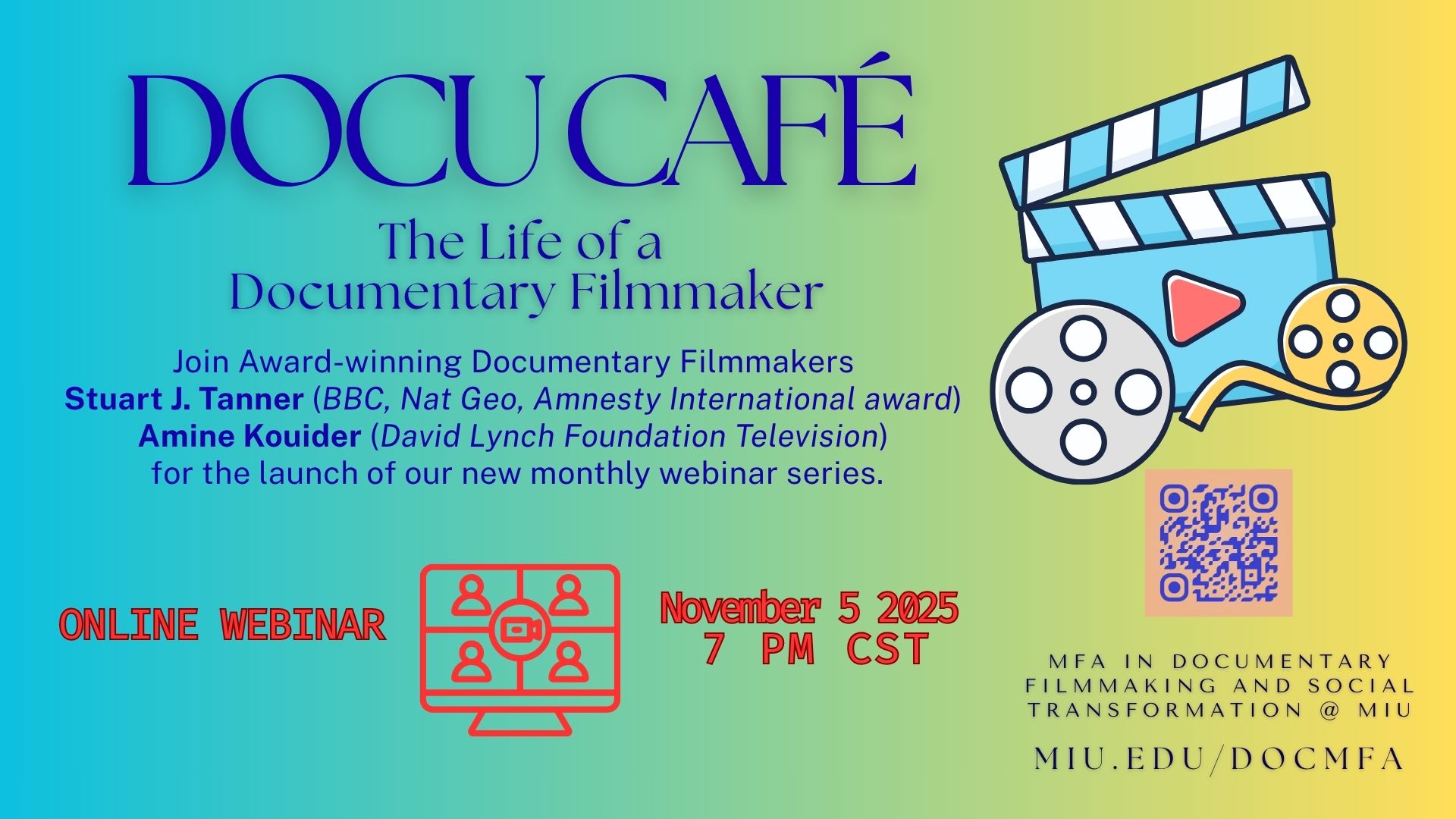 The session will be led by Stuart J. Tanner (BBC, Nat Geo, Amnesty International Award) and Amine Kouider (David Lynch Foundation, Playing for Change), program directors of MIU’s MFA in Documentary Filmmaking. Together, they’ll offer an inside look at the creative journey, challenges, and inspiration behind the life of a documentary filmmaker.
