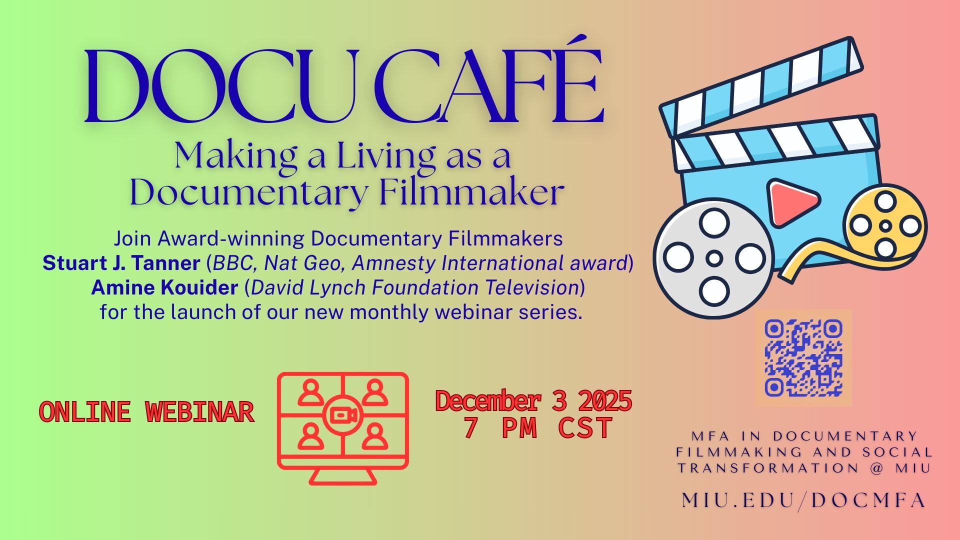 The session will be led by Stuart J. Tanner (BBC, Nat Geo, Amnesty International Award) and Amine Kouider (David Lynch Foundation, Playing for Change), program directors of MIU’s MFA in Documentary Filmmaking.