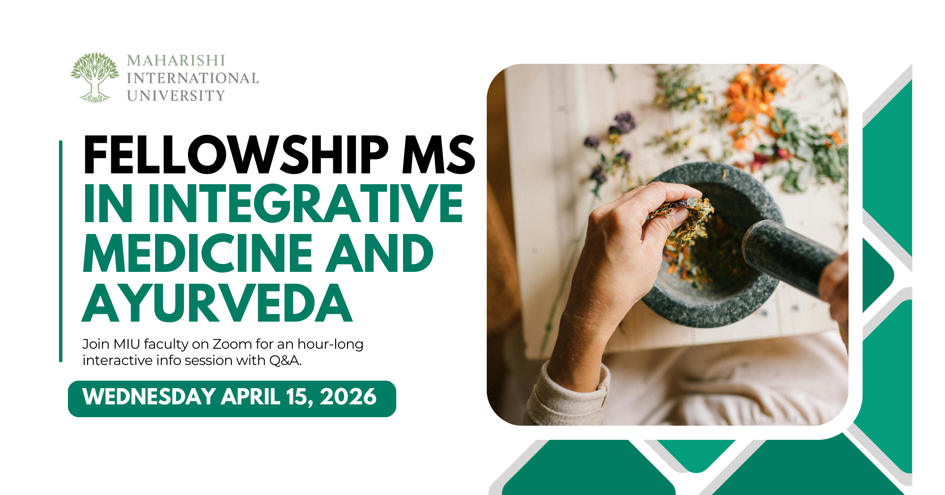Join us for a live, small-group Zoom session with medical directors and program staff from Maharishi International University to explore the Fellowship M.S. in Integrative Medicine and Ayurveda, a fully accredited, two-year online program designed for licensed clinicians.
